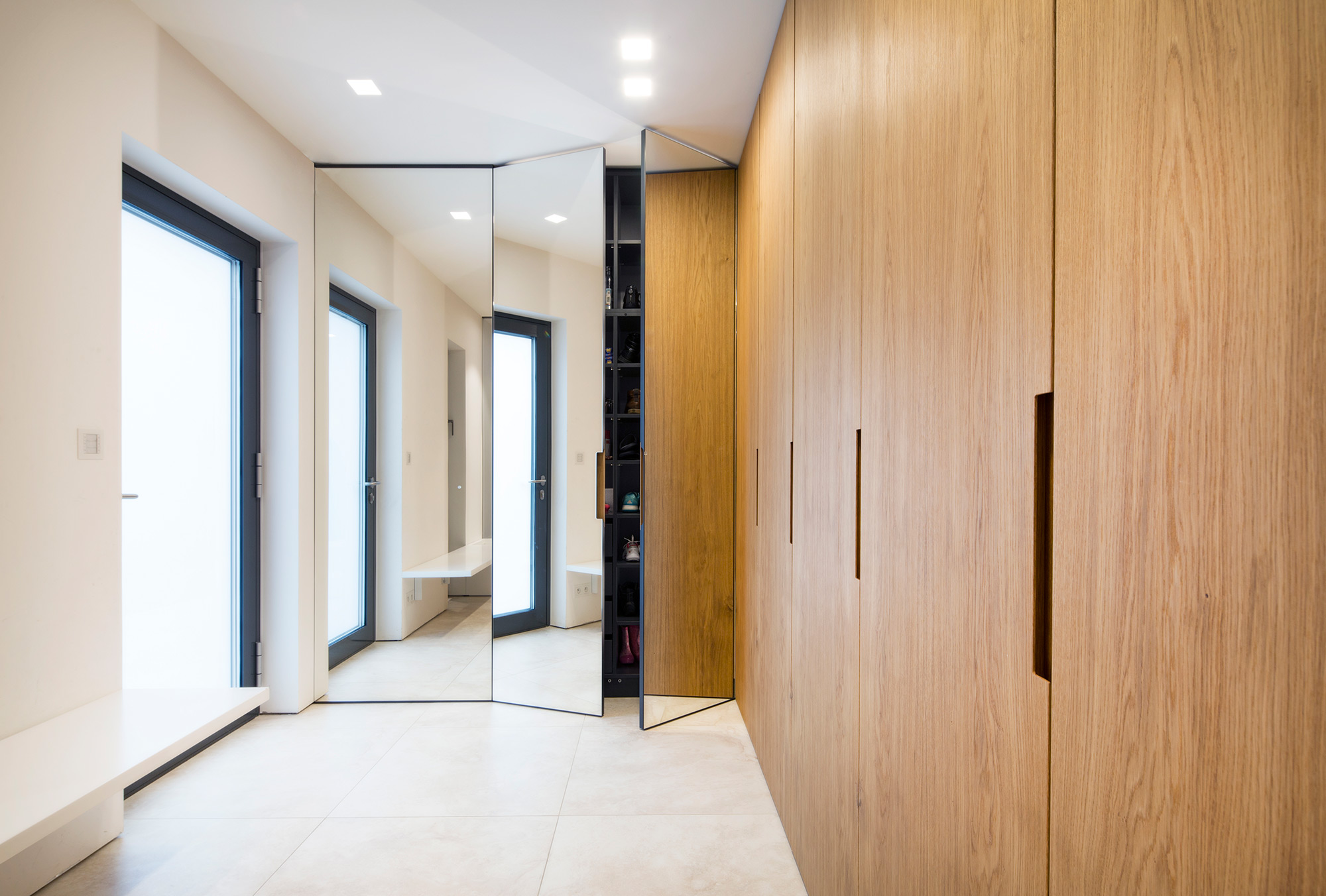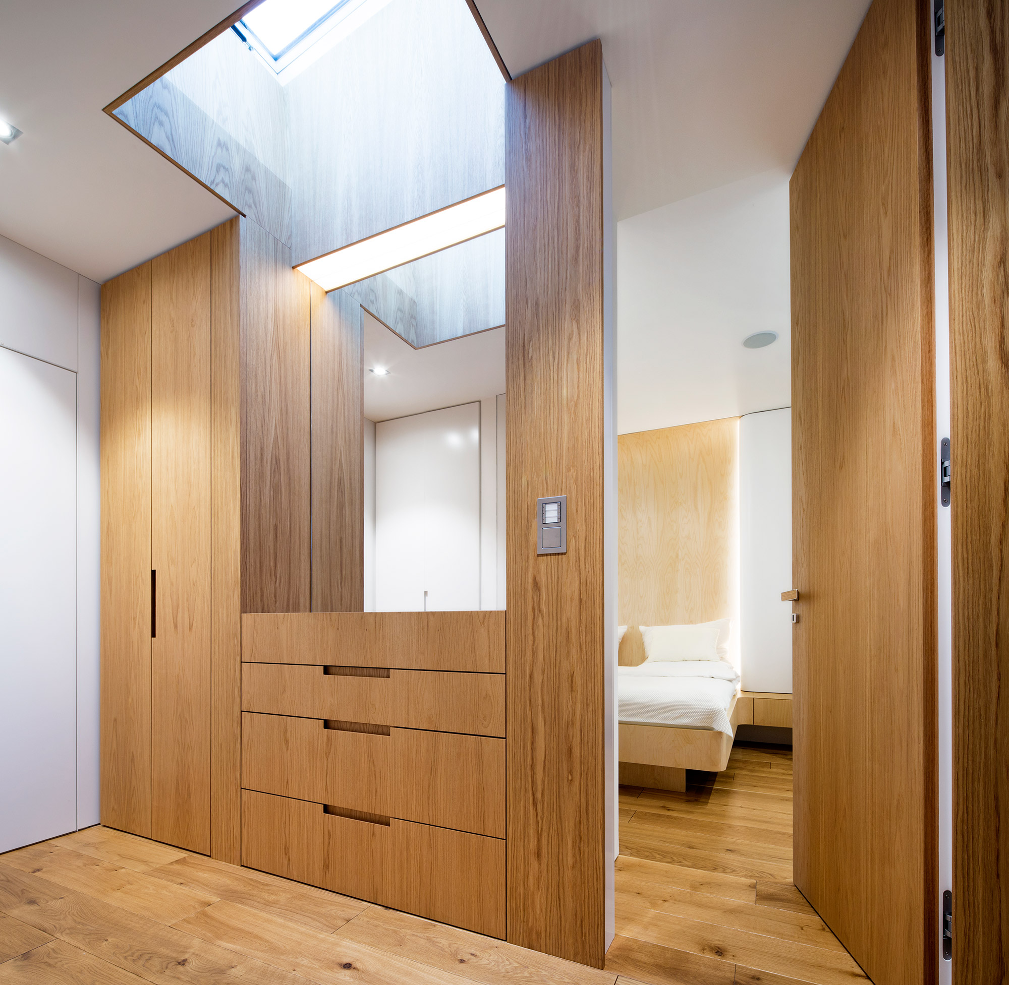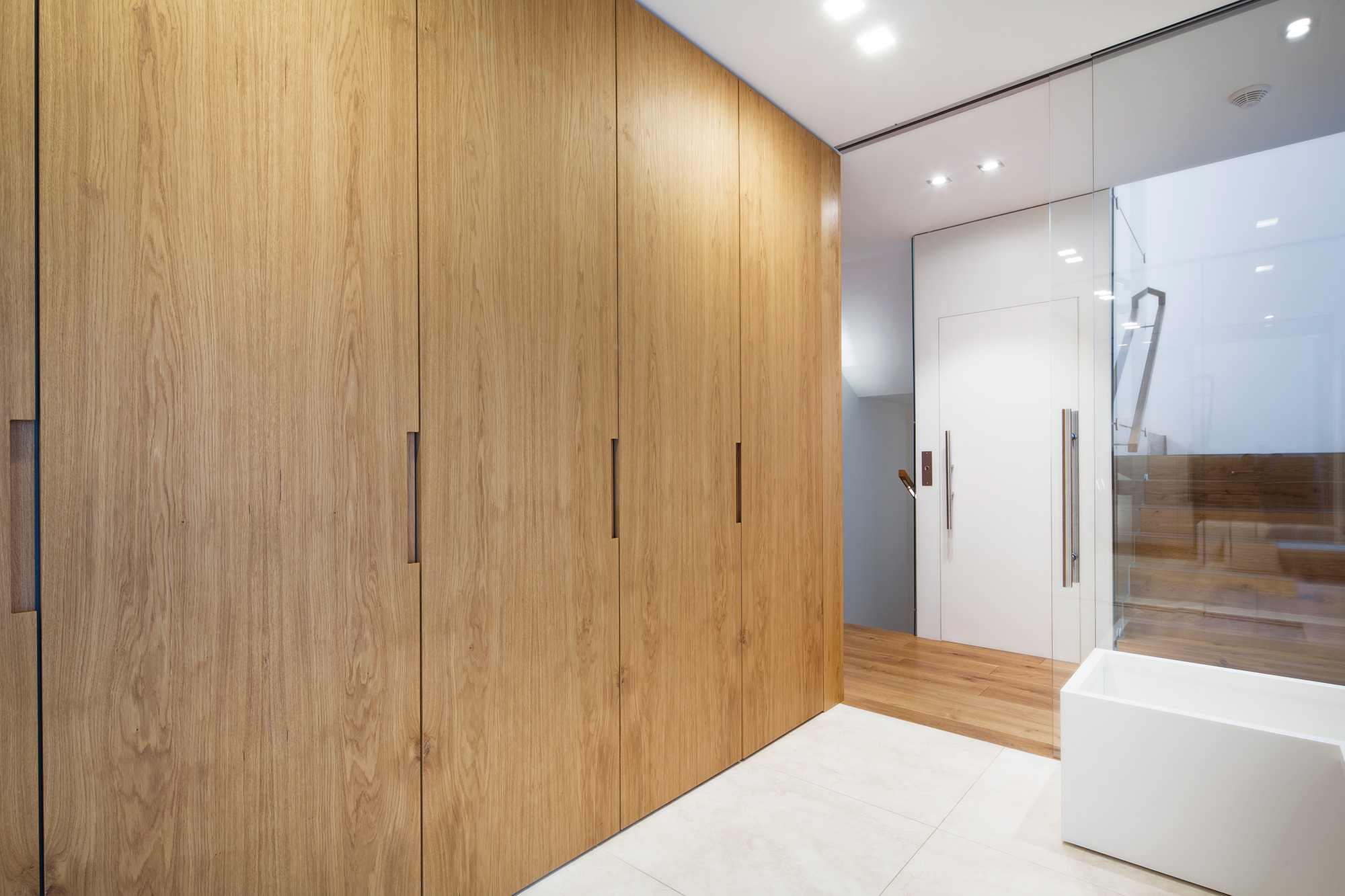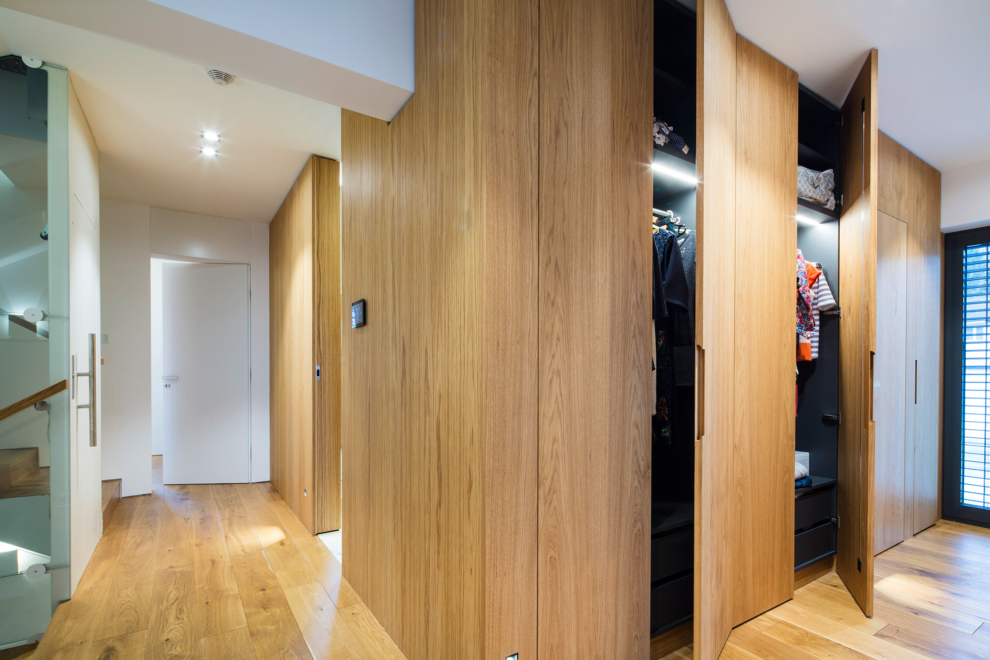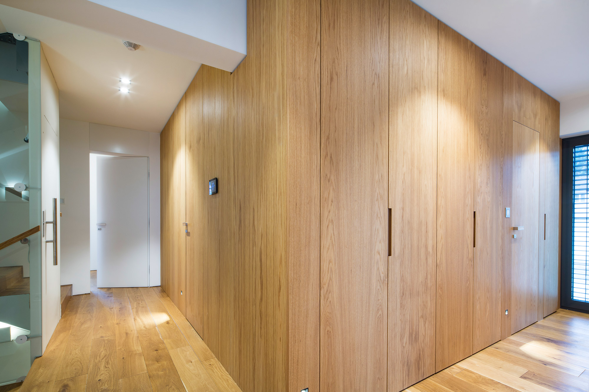 Kompletní interiér vícepodlažního pražského rodinného domu je sjednocen čistou tvarovou formou a materiálovou střídmostí. Obložení stěn chodby s dubovou dýhou v sobě ukrývají úložné prostory a dveře do některých místností. Skříně se otevírají pomocí zafrézovaných úchytek s dubovým nákližkem. Ve vybraných prostorech jsou použity ohýbané prvky z břízy.