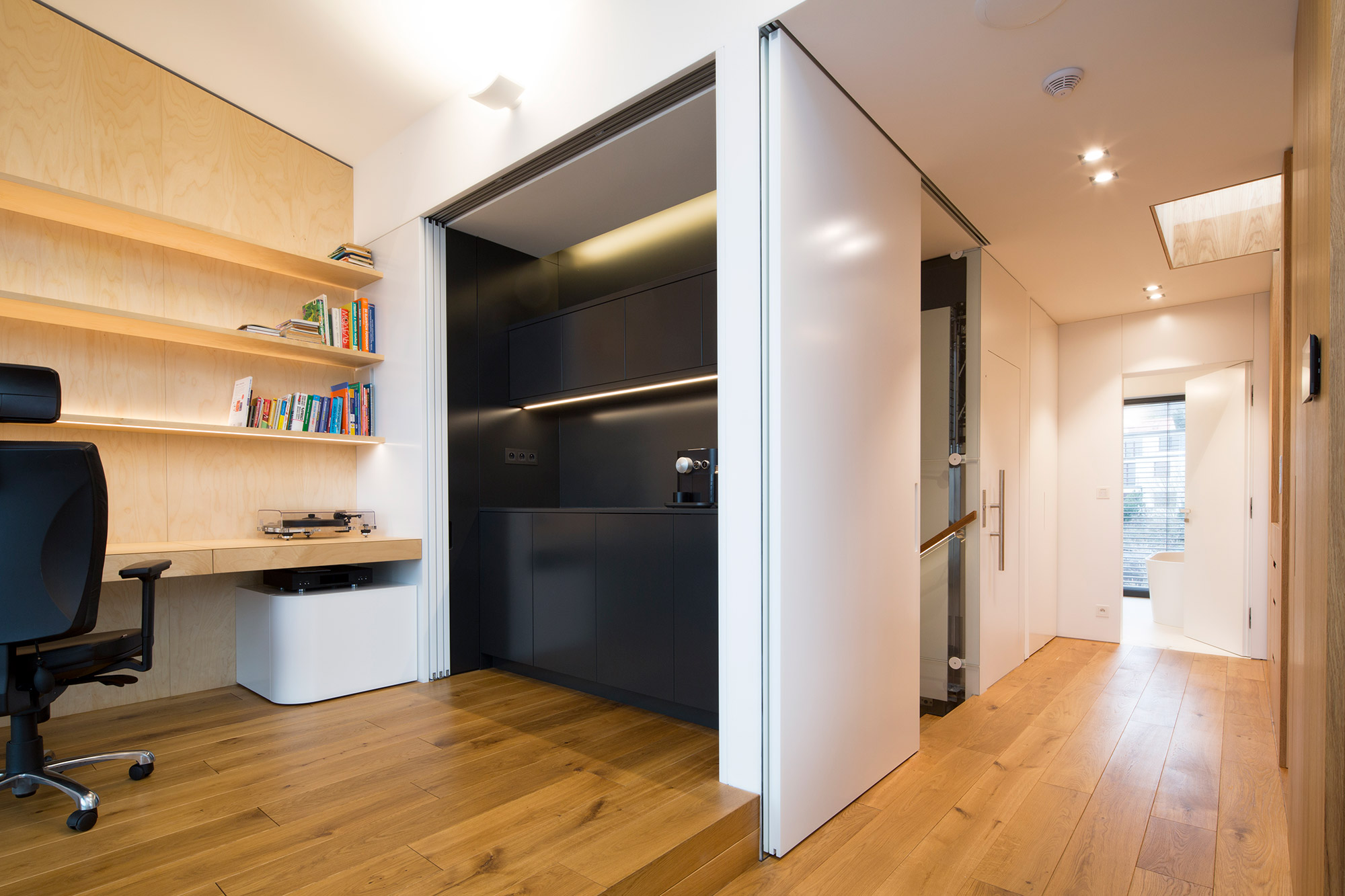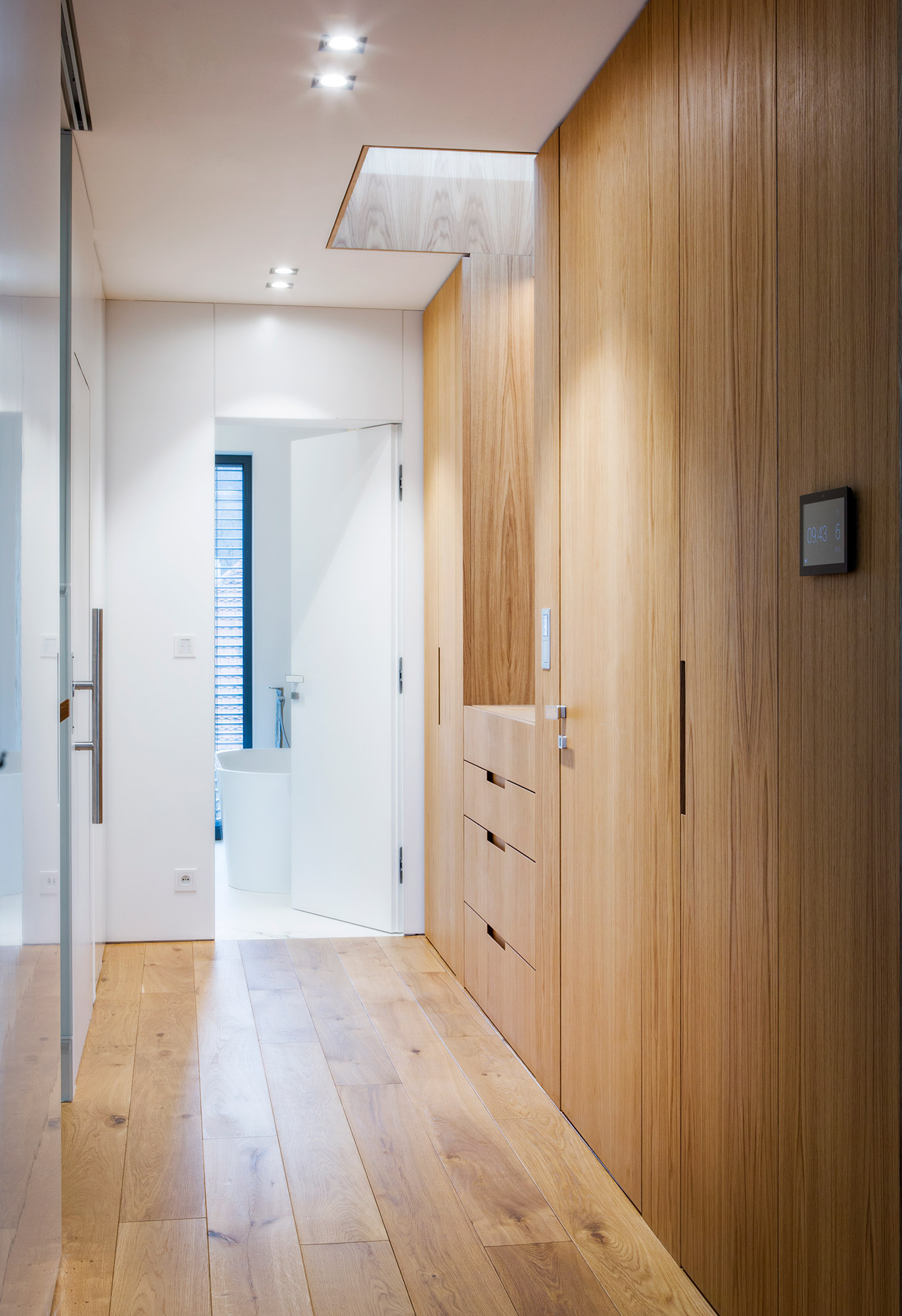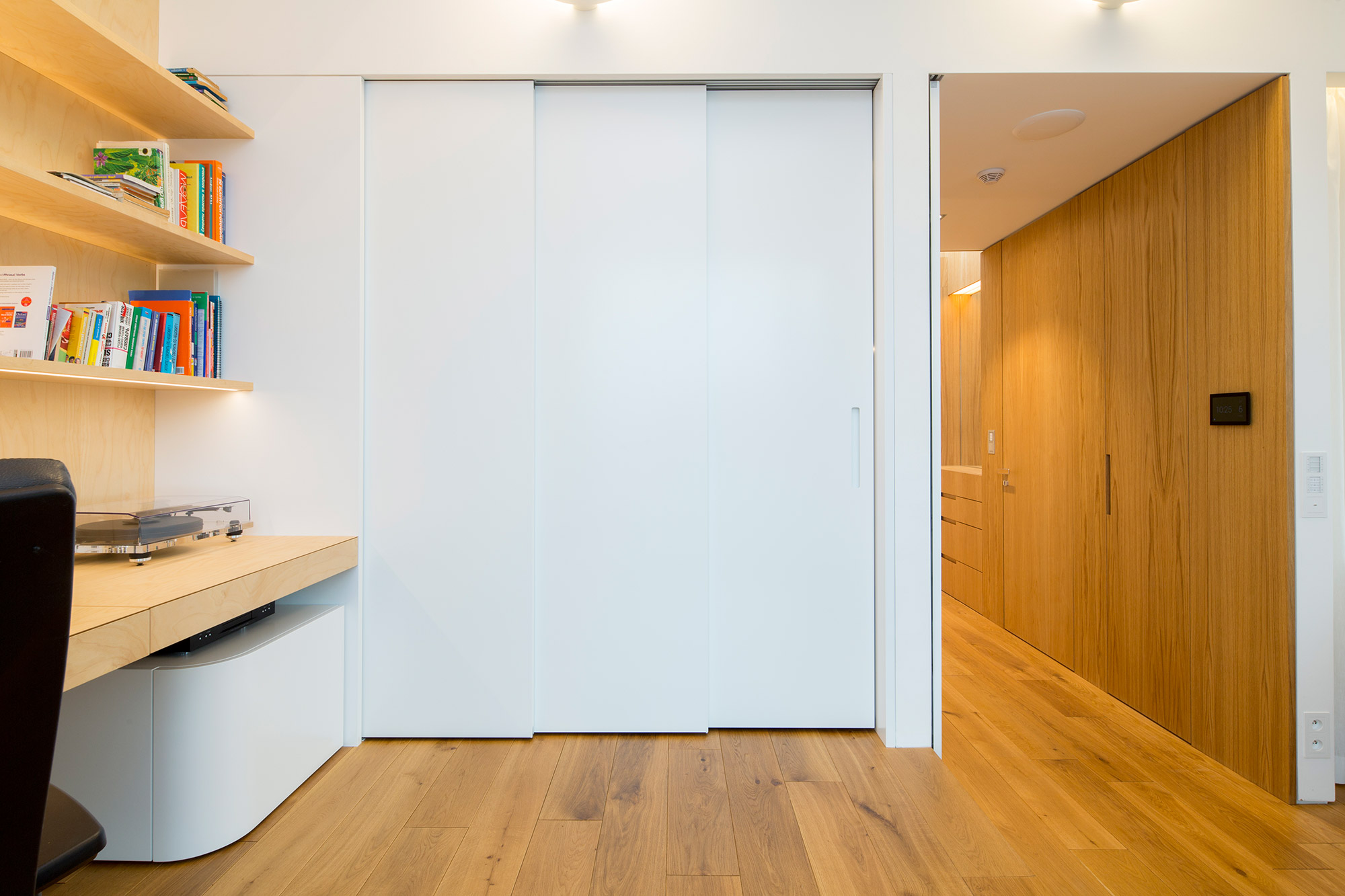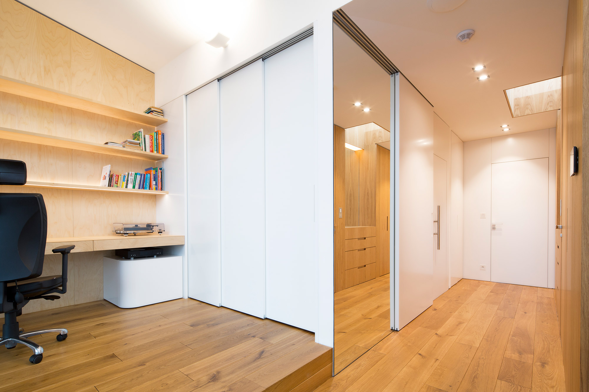 Kompletní interiér vícepodlažního pražského rodinného domu je sjednocen čistou tvarovou formou a materiálovou střídmostí. Obložení stěn chodby s dubovou dýhou v sobě ukrývají úložné prostory a dveře do některých místností. Skříně se otevírají pomocí zafrézovaných úchytek s dubovým nákližkem. Ve vybraných prostorech jsou použity ohýbané prvky z břízy.