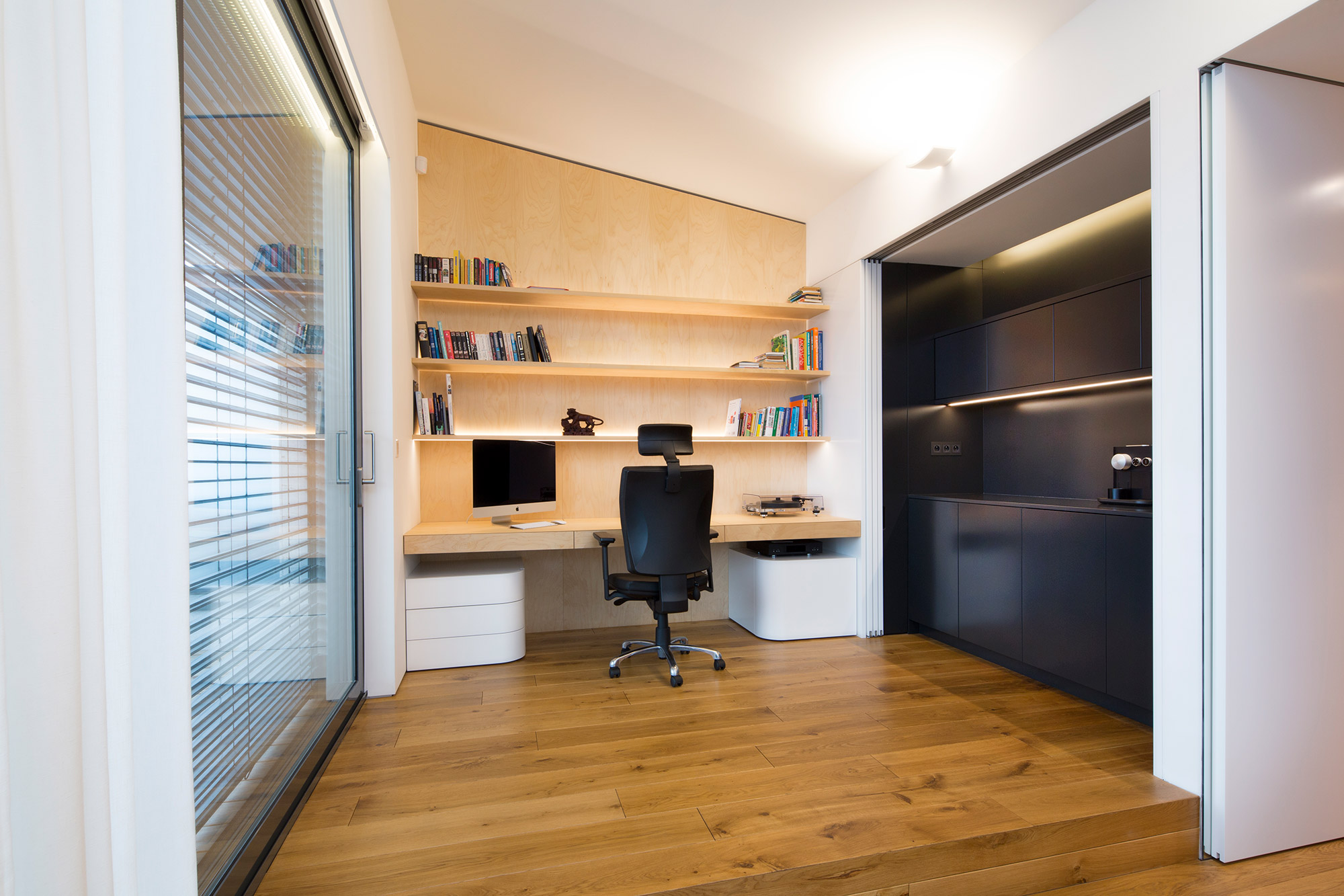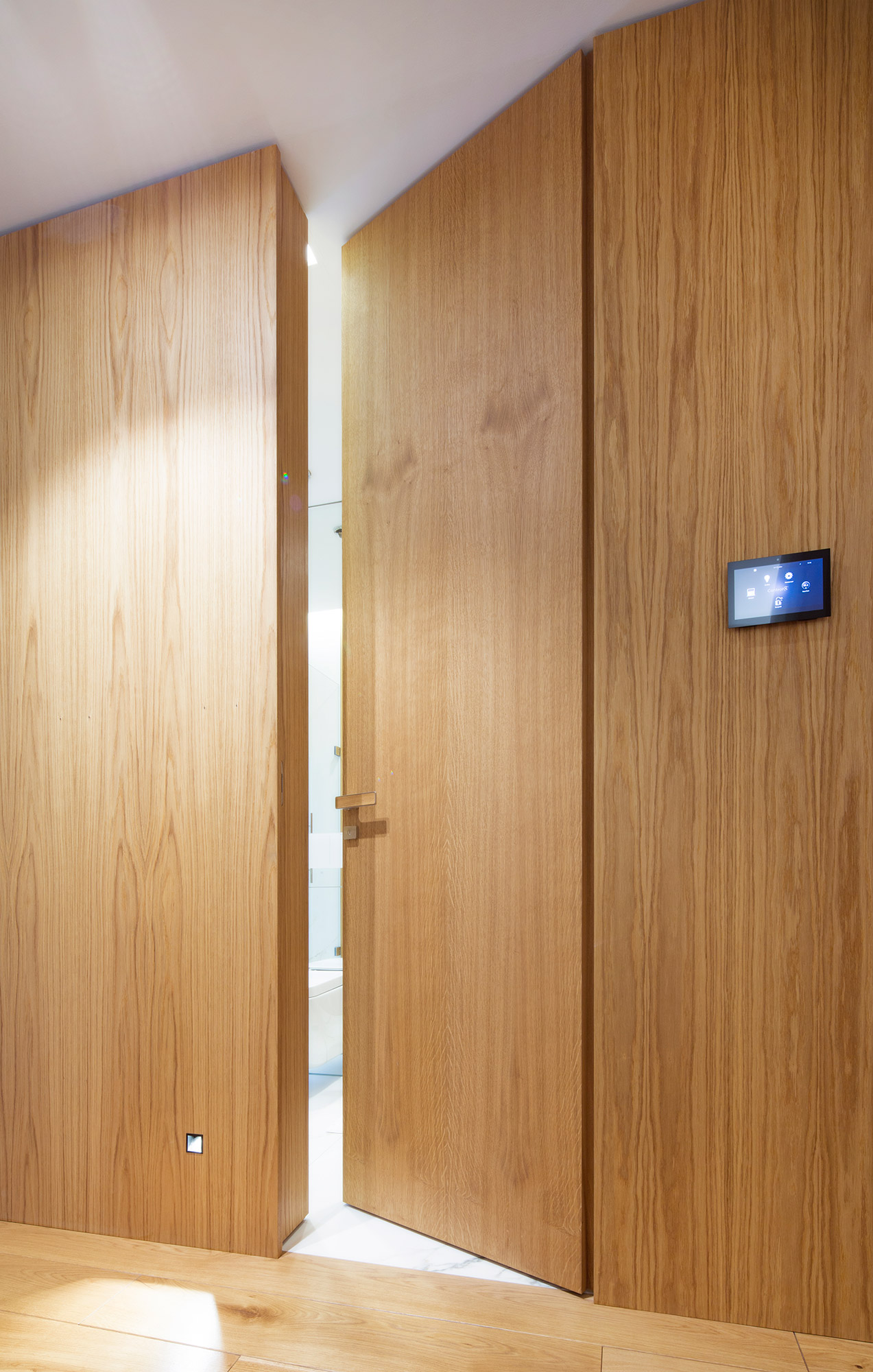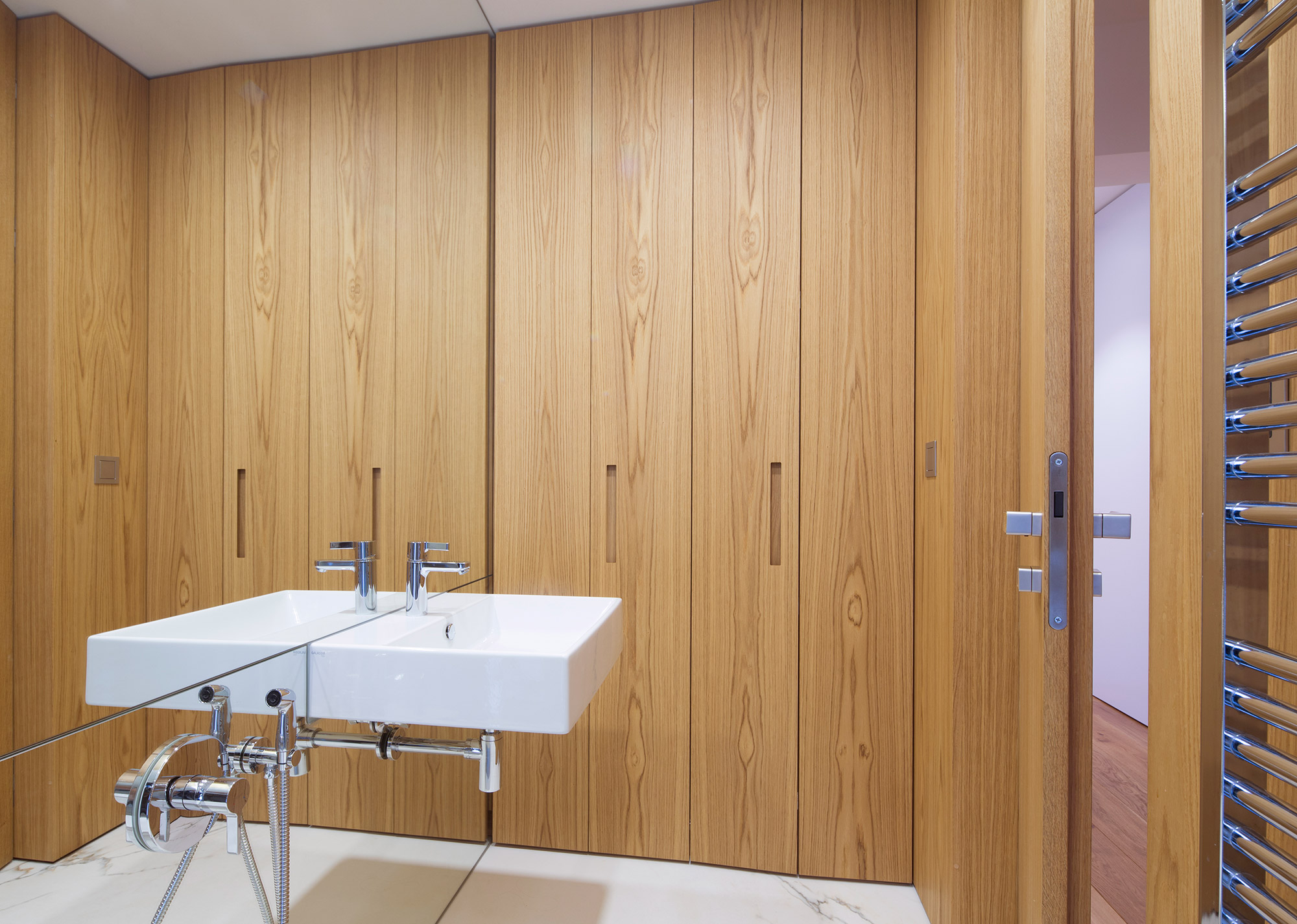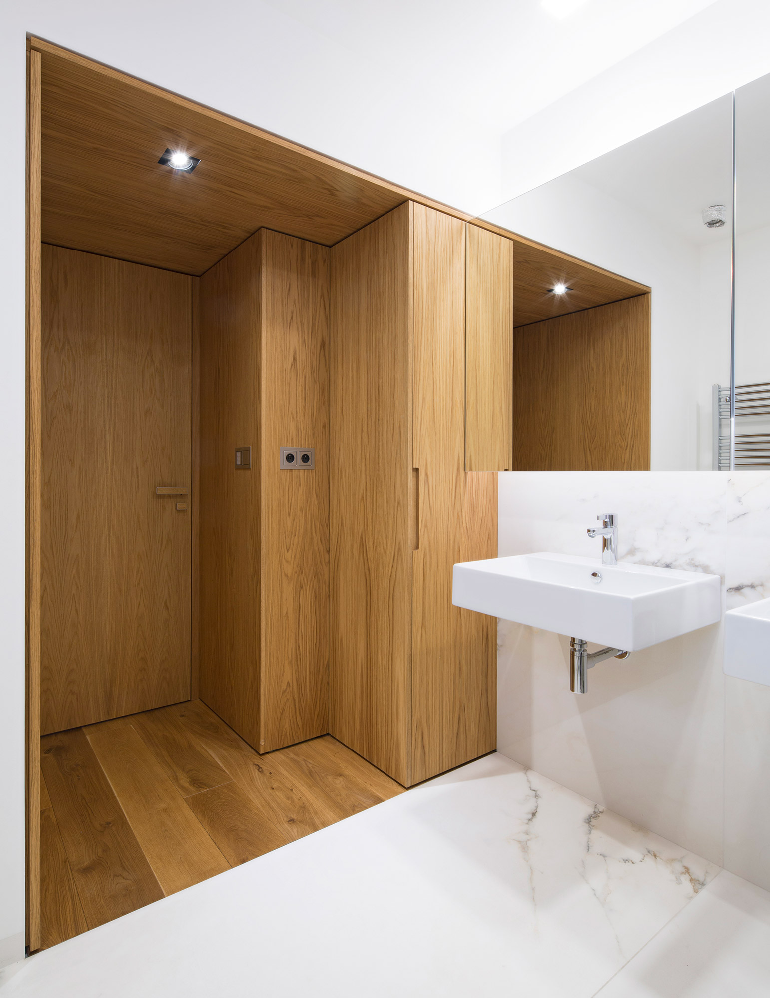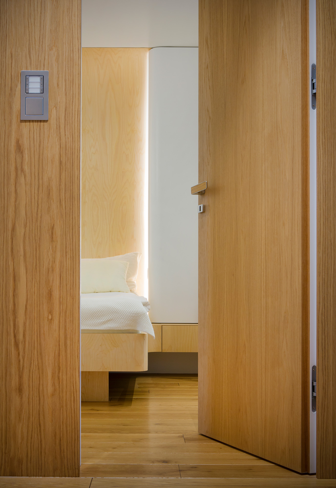 Kompletní interiér vícepodlažního pražského rodinného domu je sjednocen čistou tvarovou formou a materiálovou střídmostí. Obložení stěn chodby s dubovou dýhou v sobě ukrývají úložné prostory a dveře do některých místností. Skříně se otevírají pomocí zafrézovaných úchytek s dubovým nákližkem. Ve vybraných prostorech jsou použity ohýbané prvky z břízy.