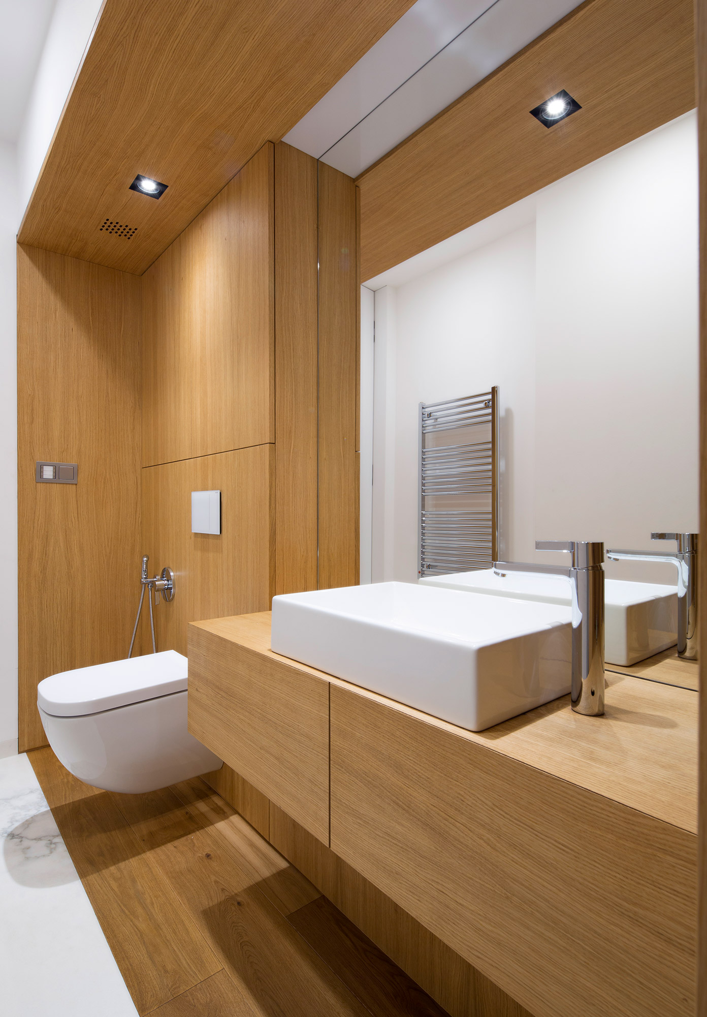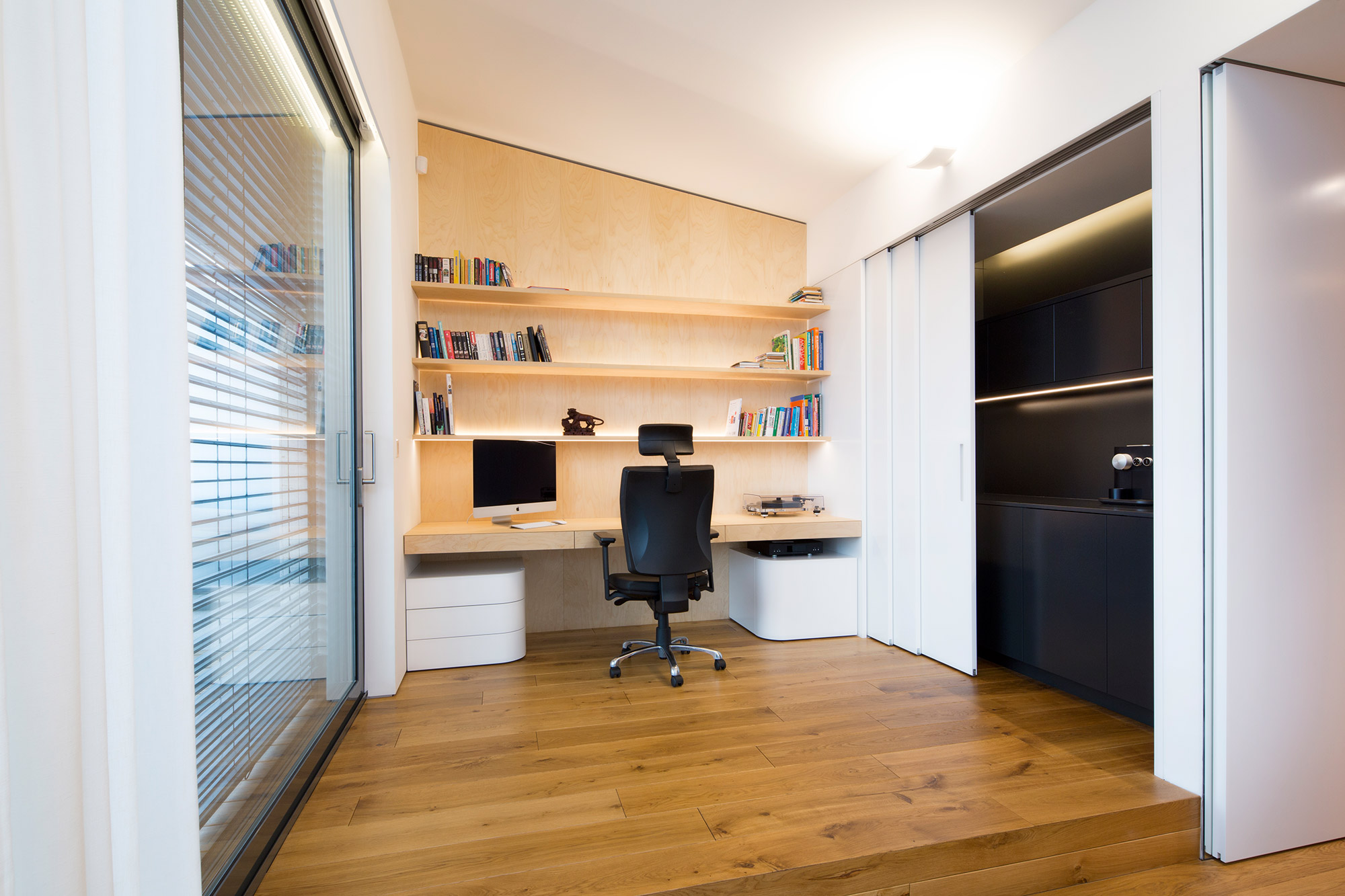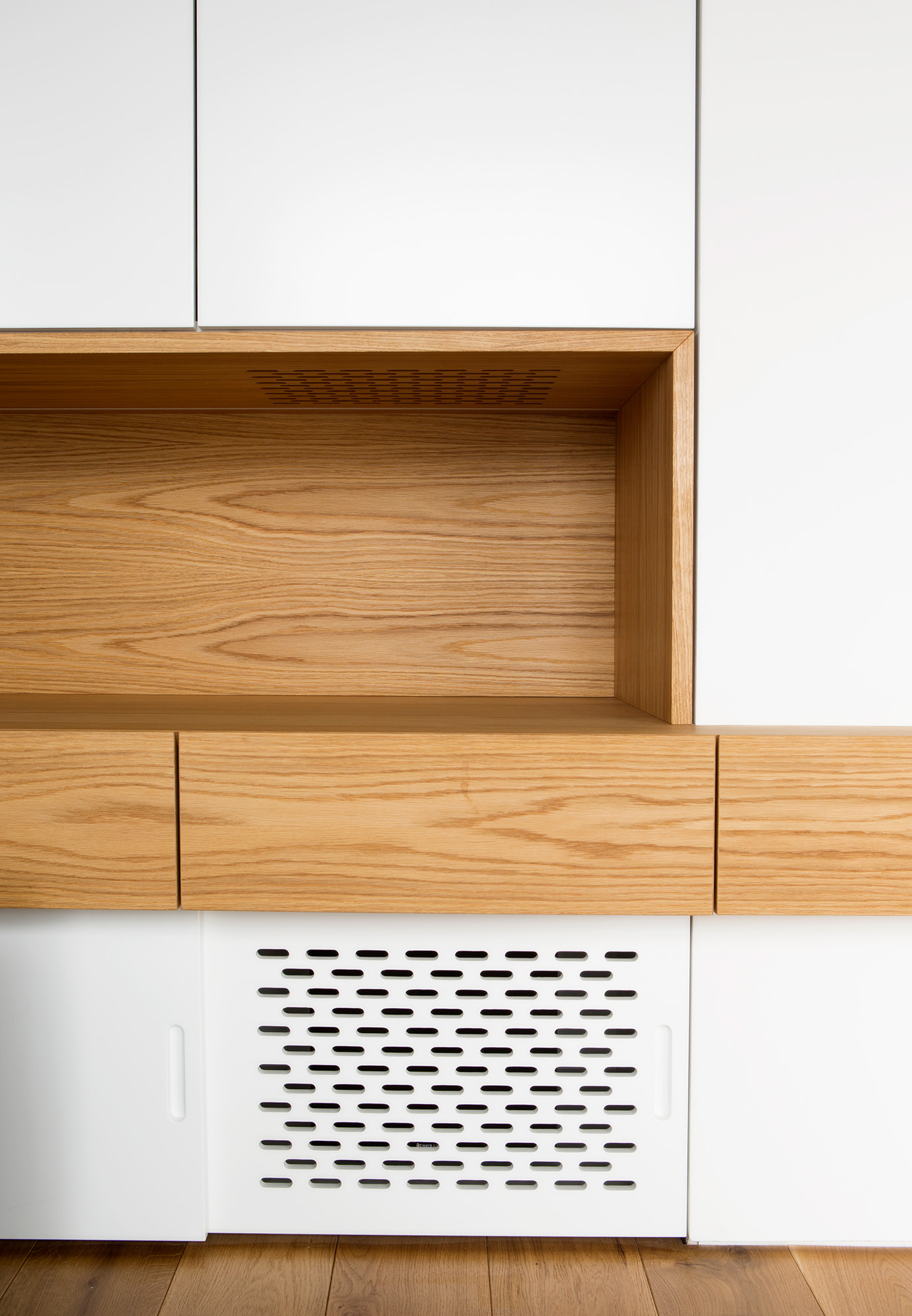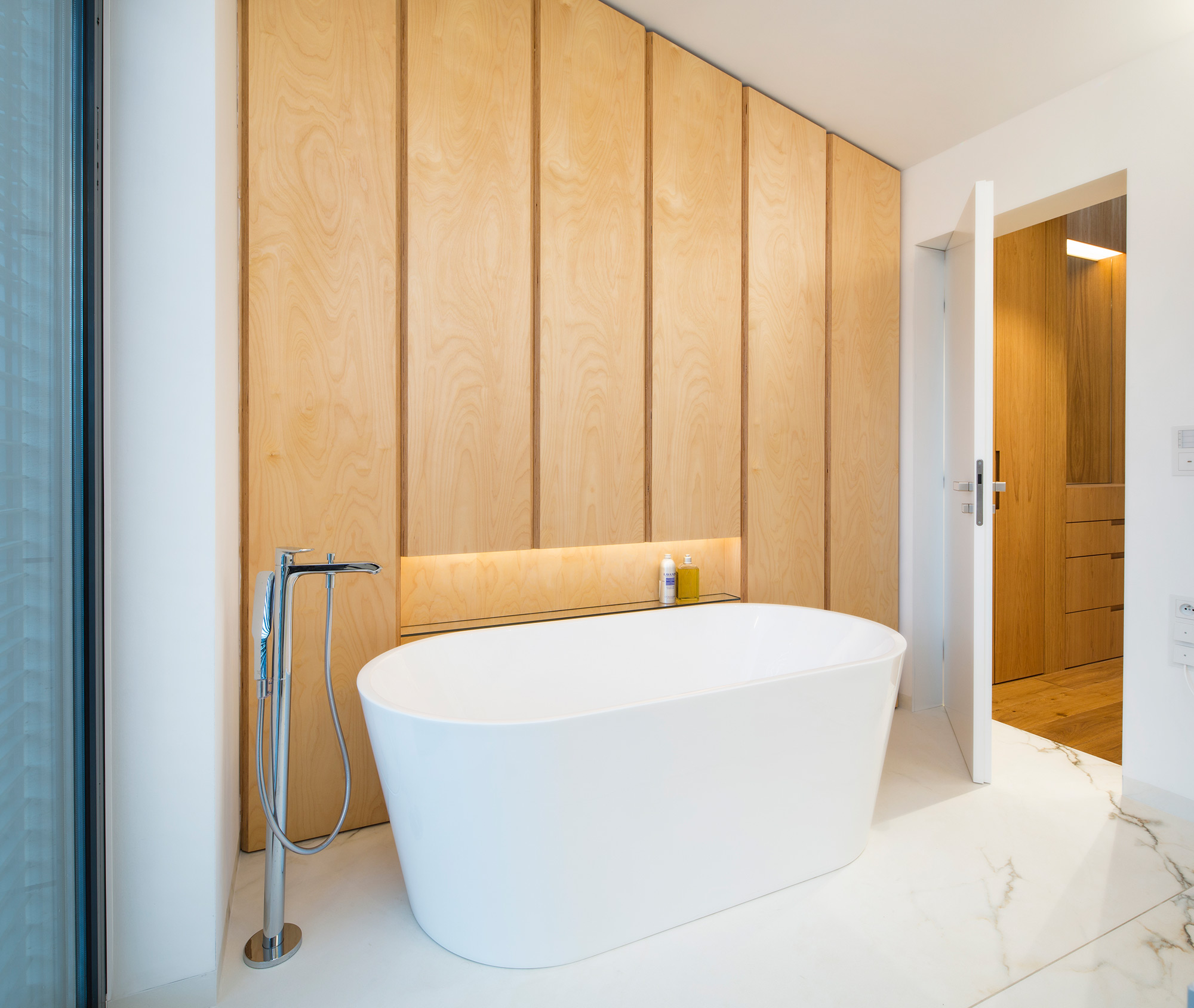 Kompletní interiér vícepodlažního pražského rodinného domu je sjednocen čistou tvarovou formou a materiálovou střídmostí. Obložení stěn chodby s dubovou dýhou v sobě ukrývají úložné prostory a dveře do některých místností. Skříně se otevírají pomocí zafrézovaných úchytek s dubovým nákližkem. Ve vybraných prostorech jsou použity ohýbané prvky z břízy.