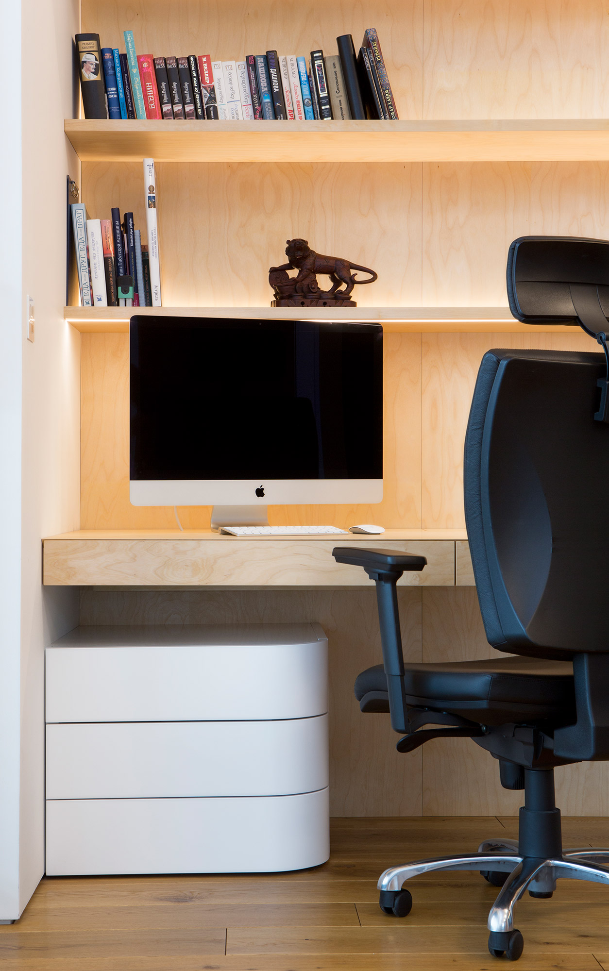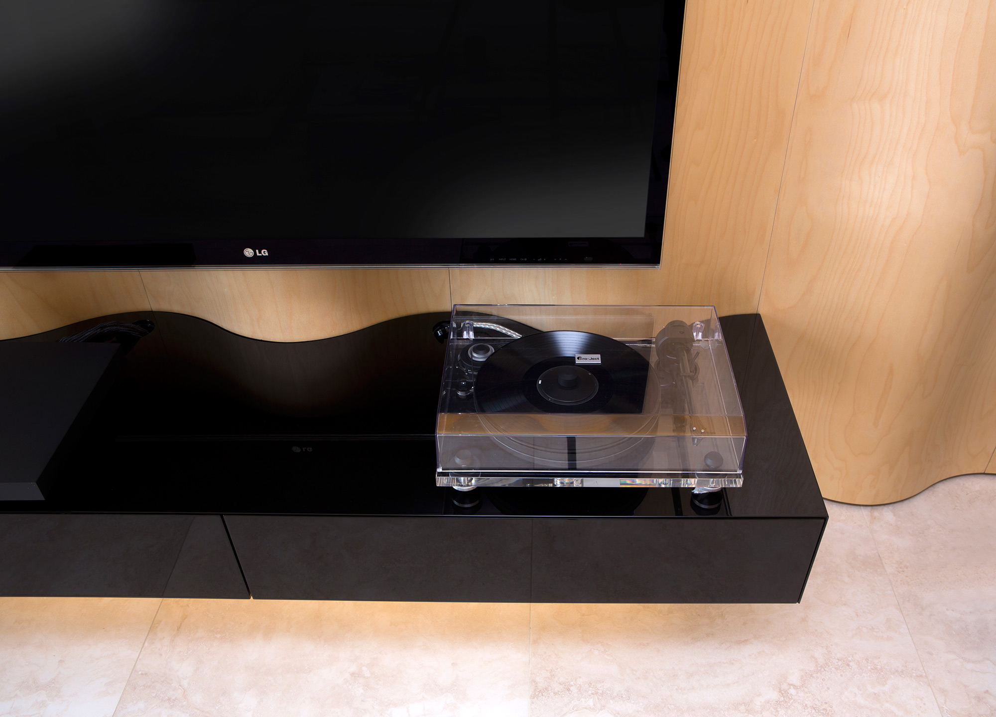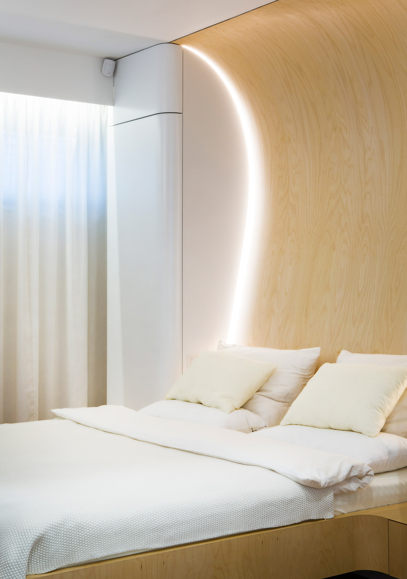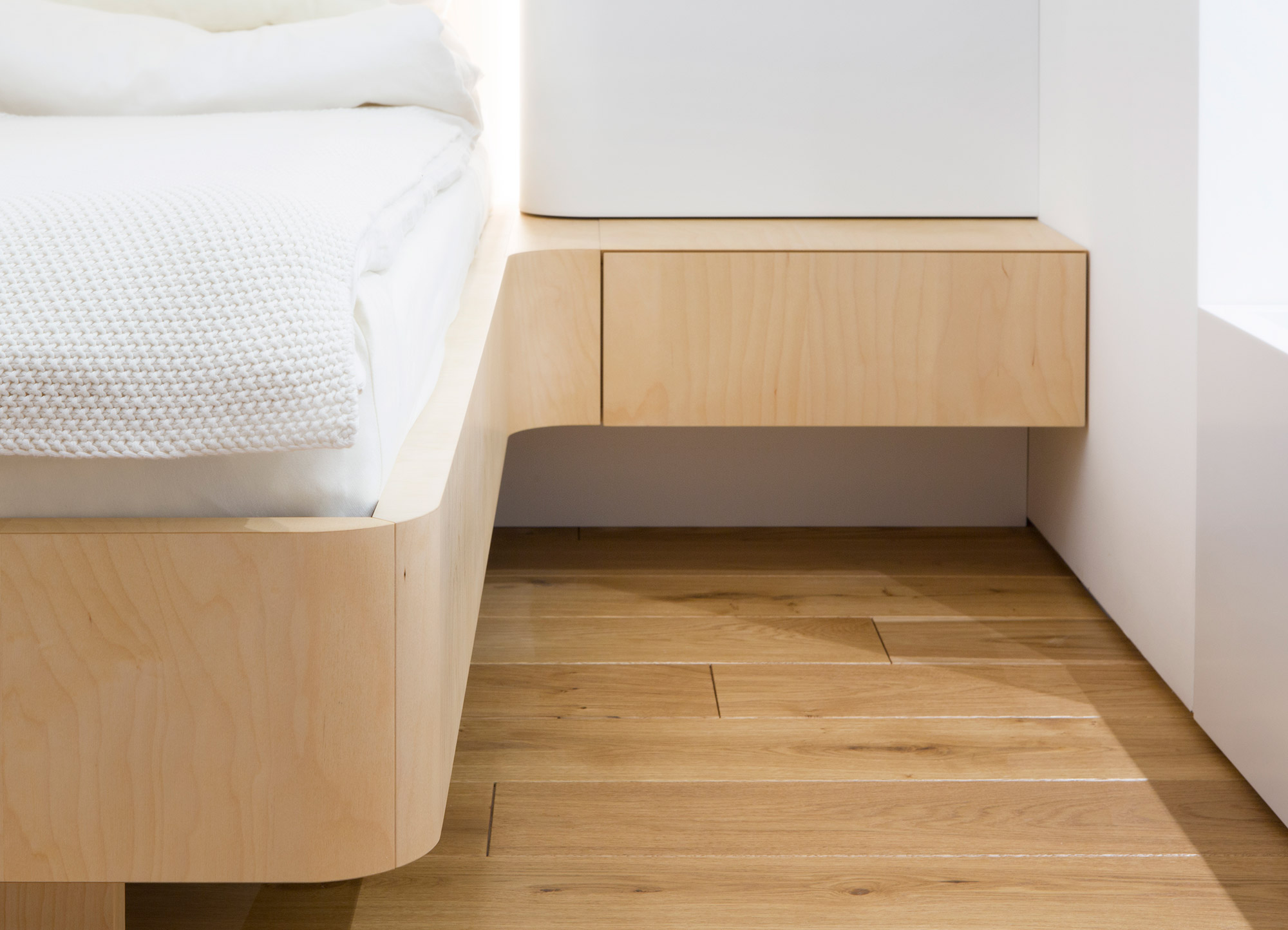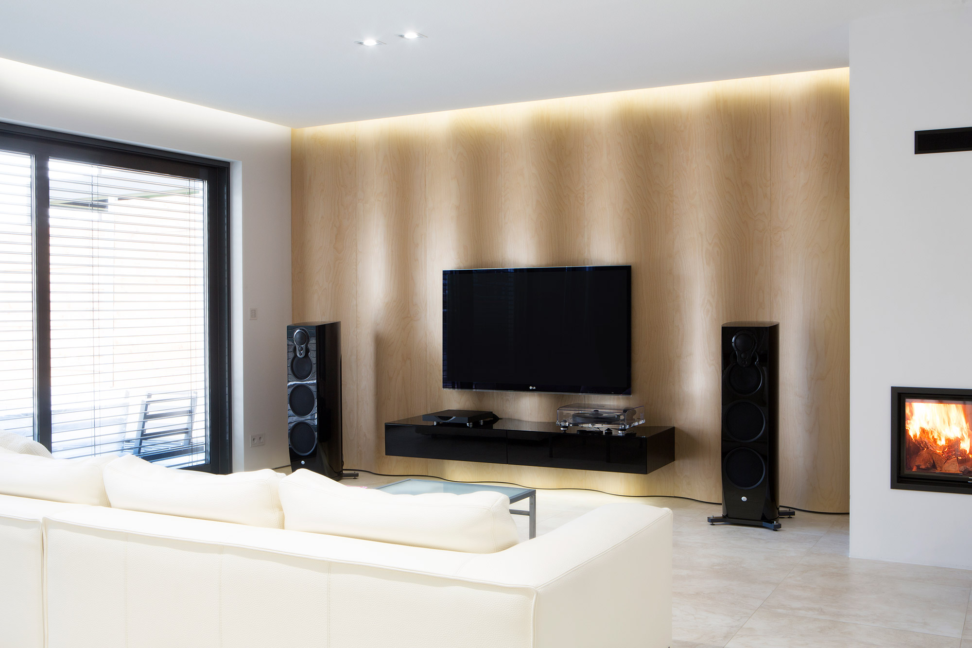 Kompletní interiér vícepodlažního pražského rodinného domu je sjednocen čistou tvarovou formou a materiálovou střídmostí. Obložení stěn chodby s dubovou dýhou v sobě ukrývají úložné prostory a dveře do některých místností. Skříně se otevírají pomocí zafrézovaných úchytek s dubovým nákližkem. Ve vybraných prostorech jsou použity ohýbané prvky z břízy.
