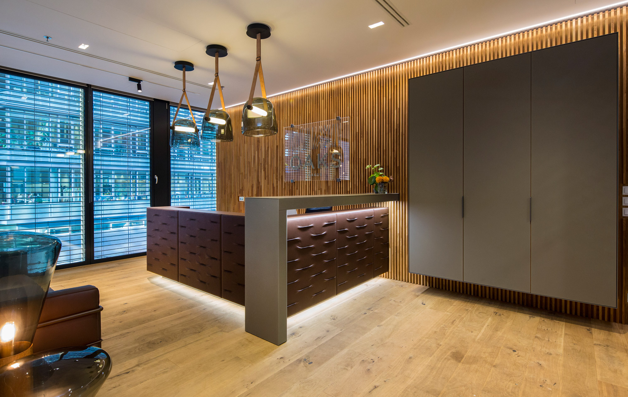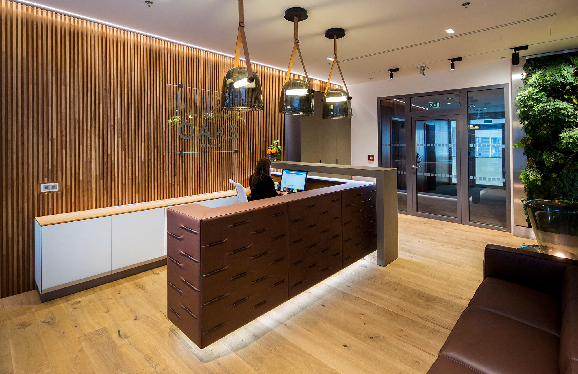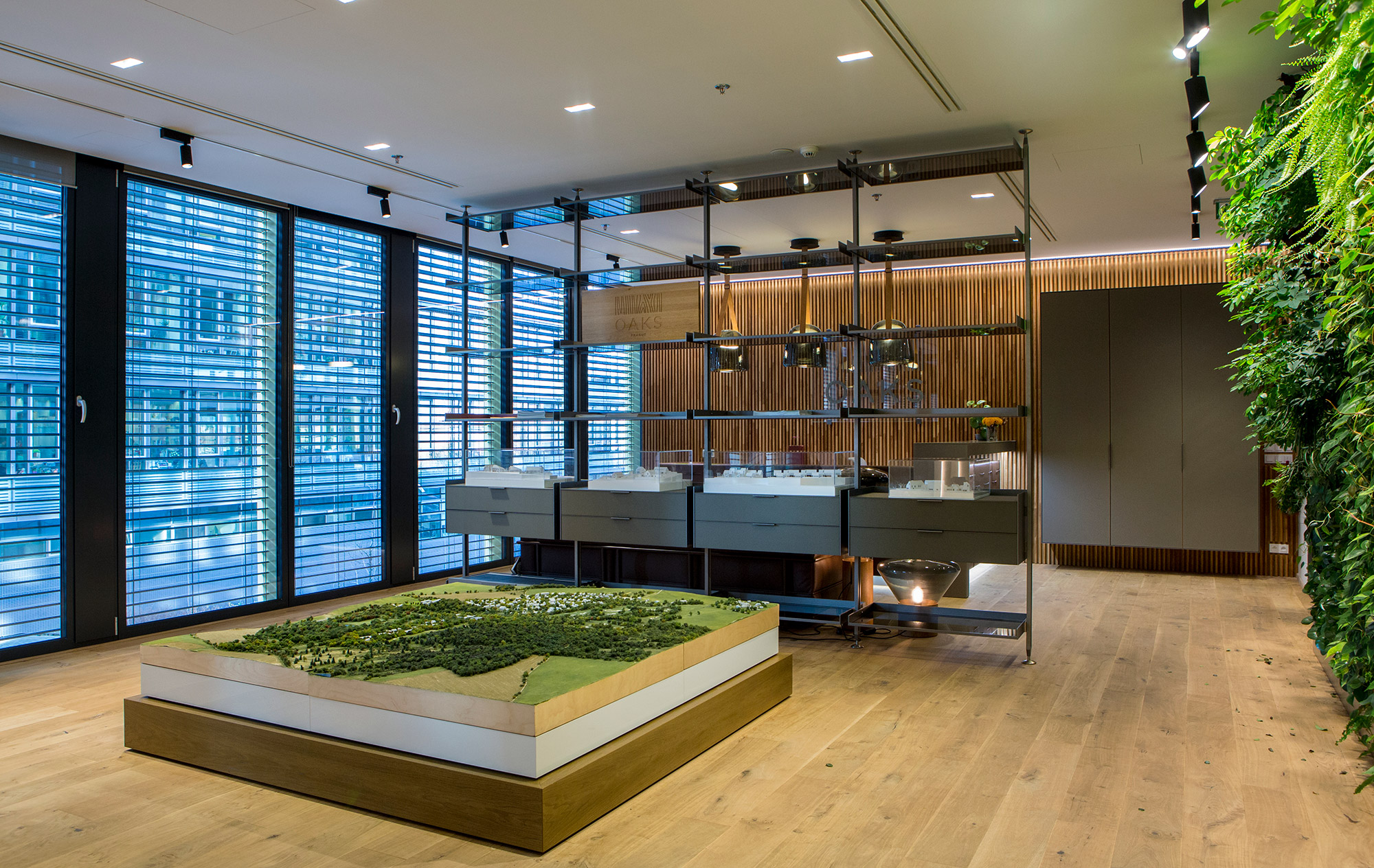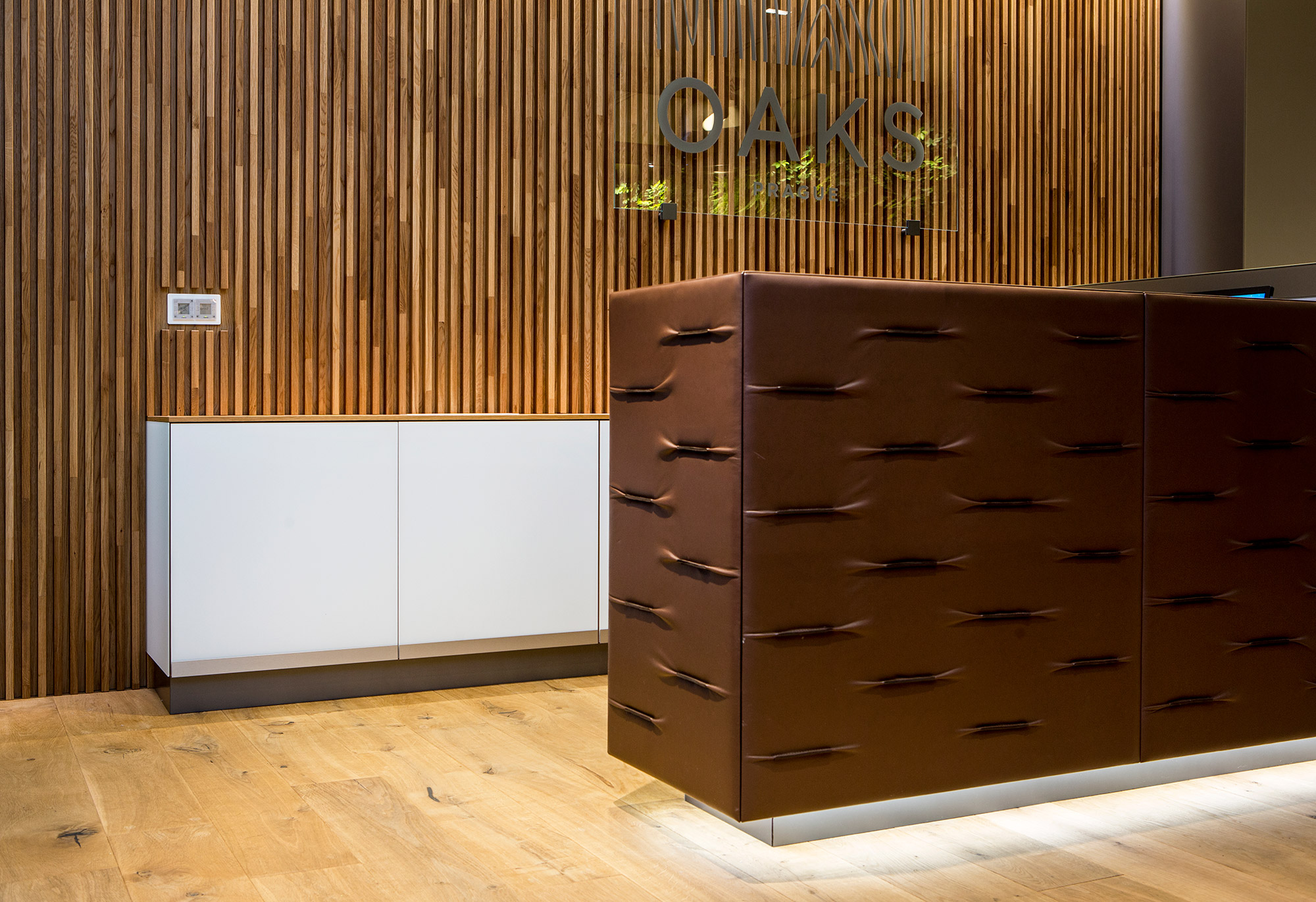 Reprezentativní kancelářský prostor developerské společnosti Arendon je z pera amerického architekta Vincenta Marani. V klientském showroomu projektu OAKS Prague jsou použity exkluzivní materiály obohaceny o živou zelenou stěnu. Dominantním prvkem je recepce potažená hovězí kůží s dekorativními záhyby.