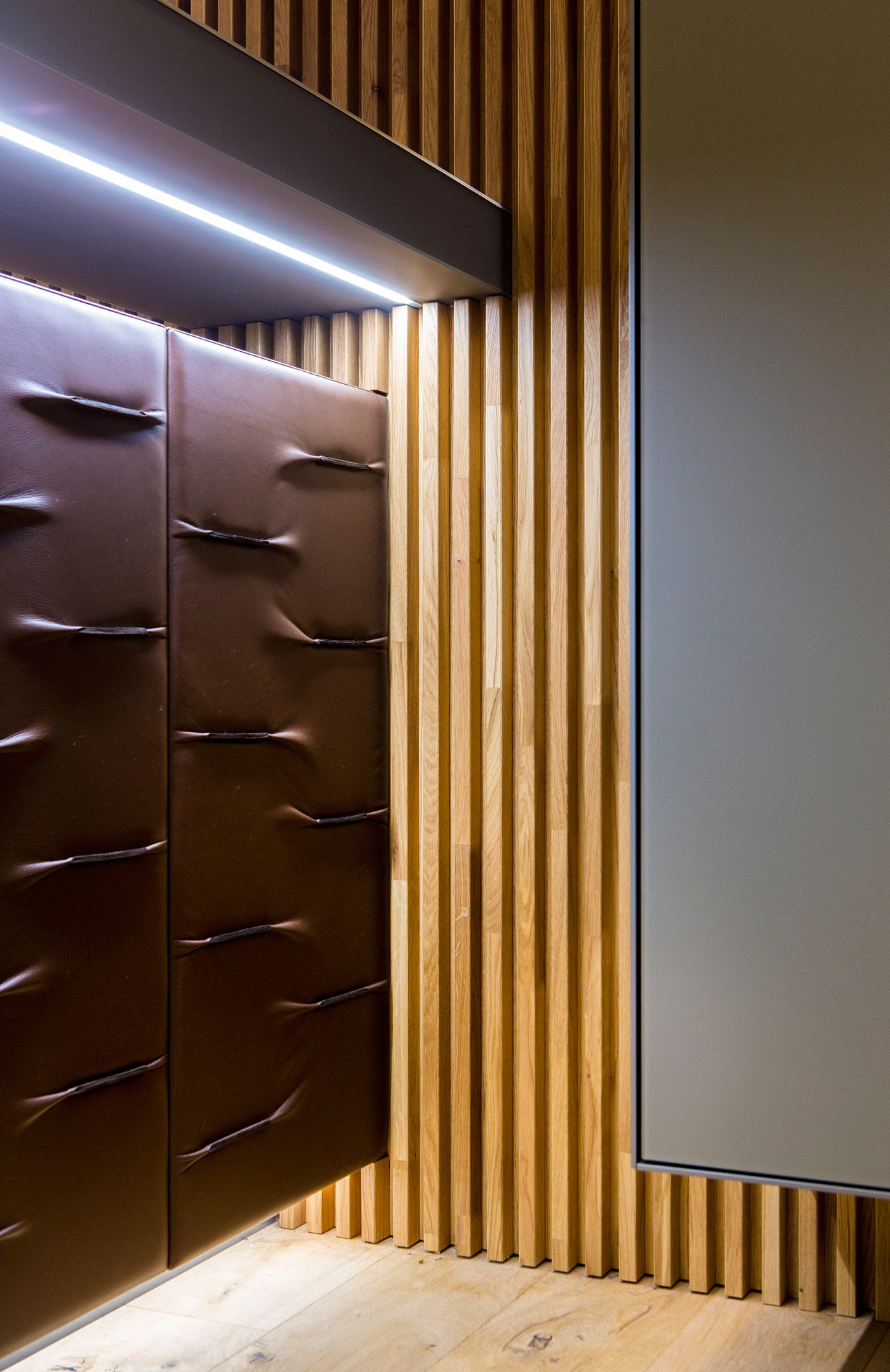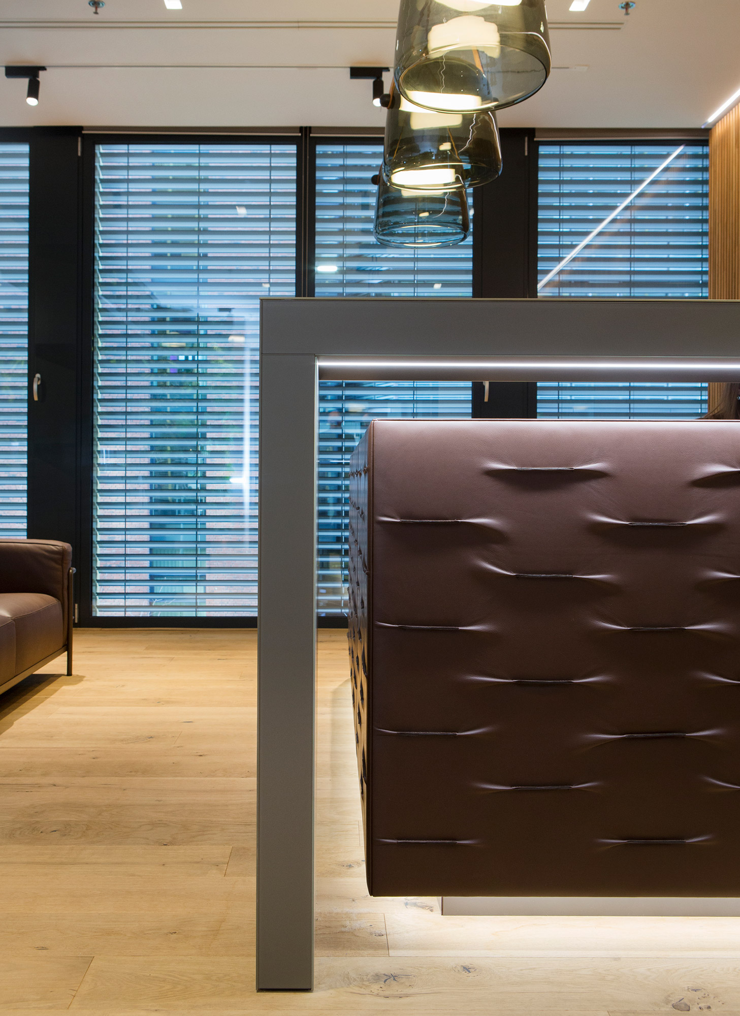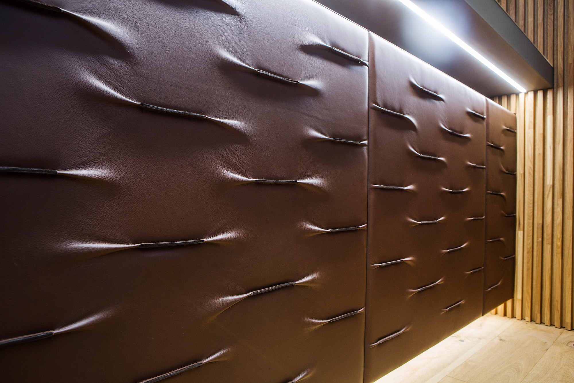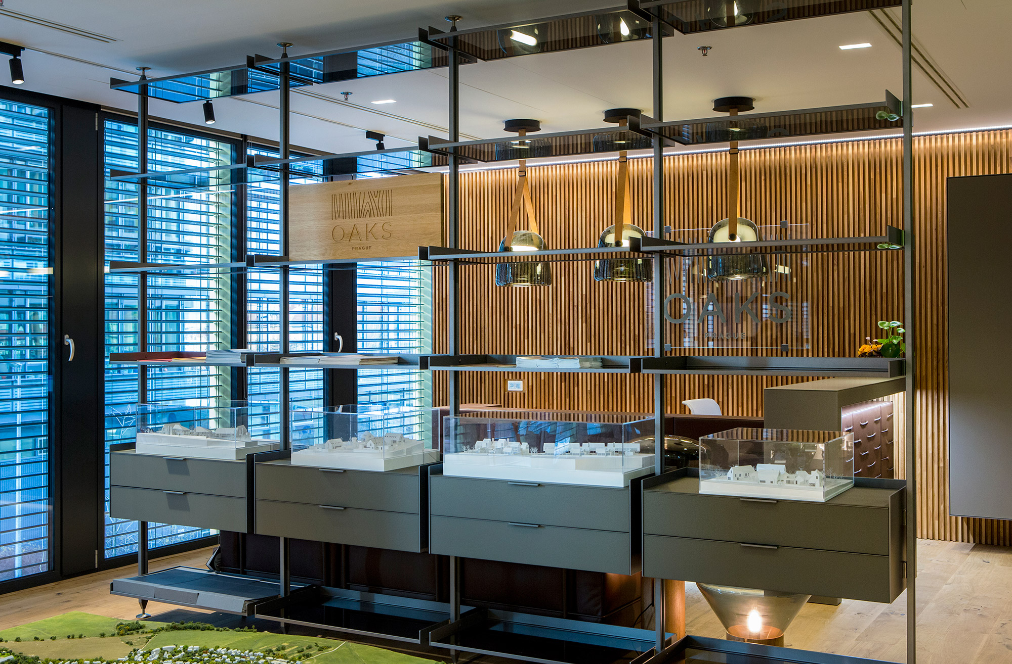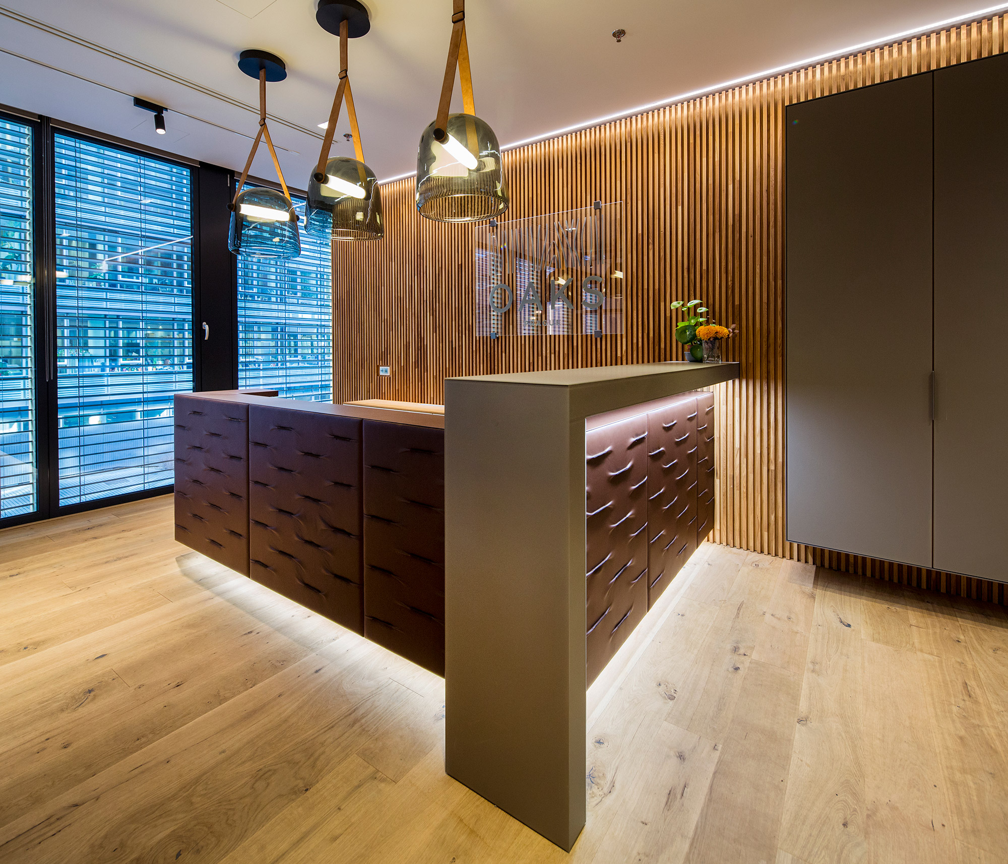 Reprezentativní kancelářský prostor developerské společnosti Arendon je z pera amerického architekta Vincenta Marani. V klientském showroomu projektu OAKS Prague jsou použity exkluzivní materiály obohaceny o živou zelenou stěnu. Dominantním prvkem je recepce potažená hovězí kůží s dekorativními záhyby.